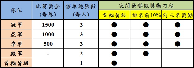 2. 最終隊伍排名為本次報名隊伍總數之前10%可加碼獎勵夜間榮譽假乙張。