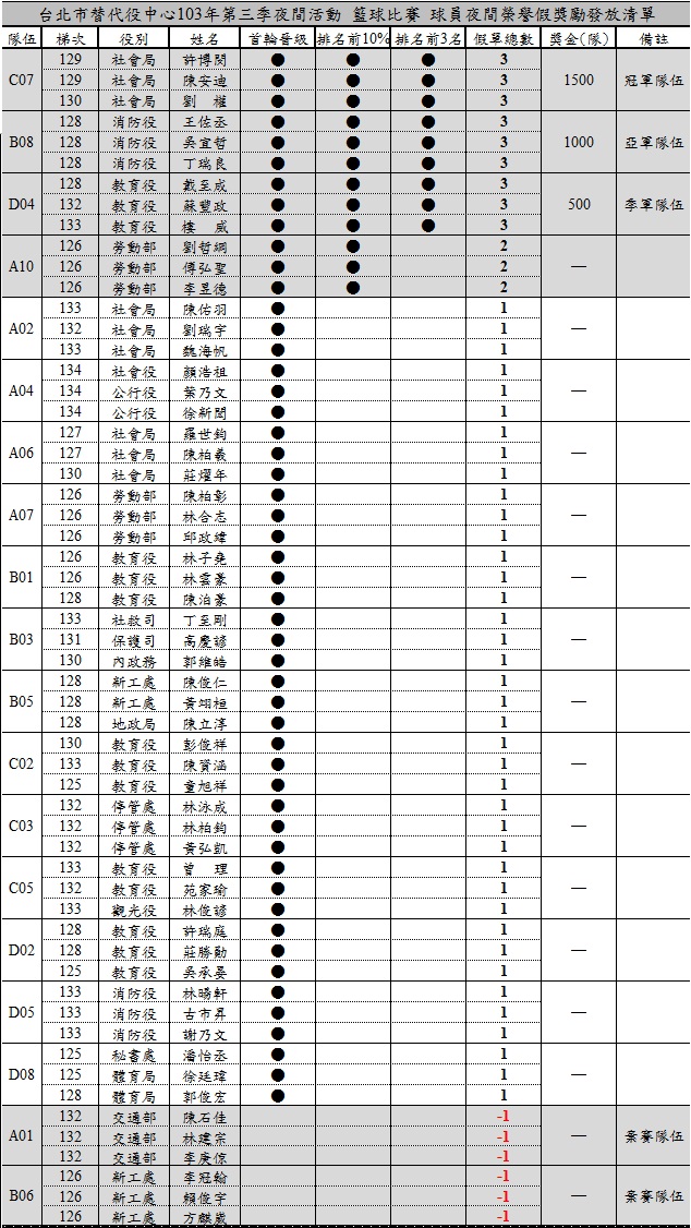 各位參與台北市替代役中心第103年第三季夜間活動 籃球比賽的球員請注意,比賽目前已經結束ABCD組第二輪,進入12強階段,感謝各位球員的踴躍參與,台北市替代役中心本次夜間活動核發榮譽假之標準為:
